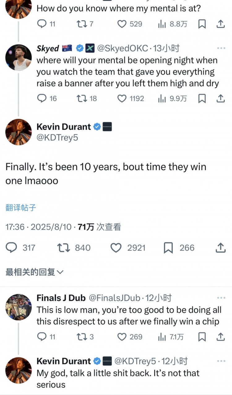 杜兰特:“我的上帝啊,只是回喷一点垃圾话。这事没那么严肃。”