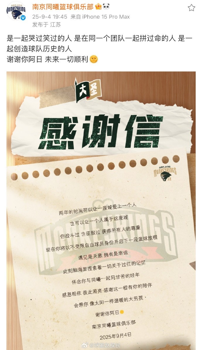 媒体人@球圈赵探长 在社媒上谈到了此事:“南京同曦正式宣布曾繁日离队,同时官方社媒发布对后者两年贡献的感谢。