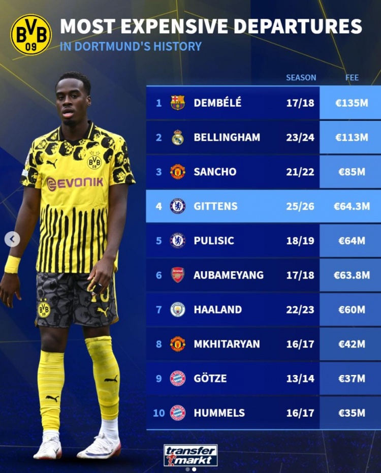 7月6日讯 切尔西已经官宣签下多特边锋吉滕斯,《转会市场》统计显示后者也是多特队史出售的第4贵球员。