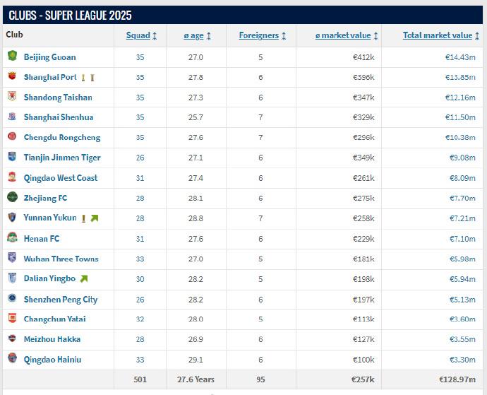 06月19日讯 转会市场网2025年中期中国身价例行更新今天完成,对比上次更新,各俱乐部的身价发生了不少变化。