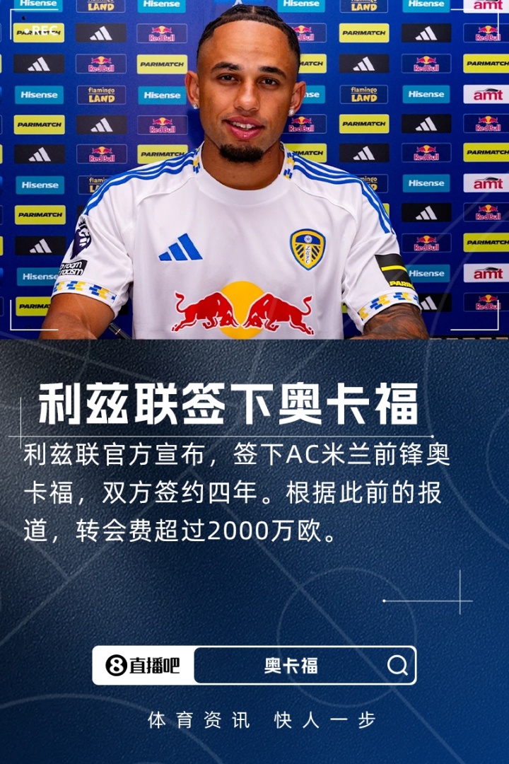 08月21日讯 官方消息,利兹联签下米兰前锋奥卡福,双方签约四年,据此前罗马诺报道,转会费超2000万欧。奥卡福这也是利兹联今夏第九名新援。